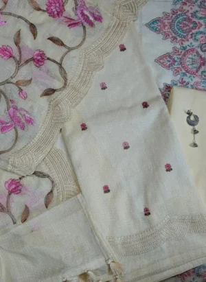 Off-White Kota Cotton Suit with Pink Thread Embroidery & Printed Dupatta
