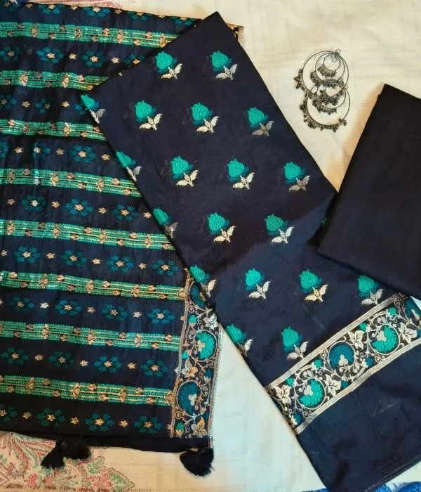 Elevate your ethnic collection with this beautifully woven black Banarasi suit set, crafted for comfort and timeless charm.