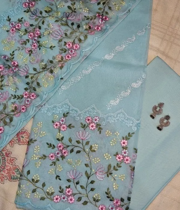 Dupatta Work: Intricate thread embroidery with scalloped floral edging