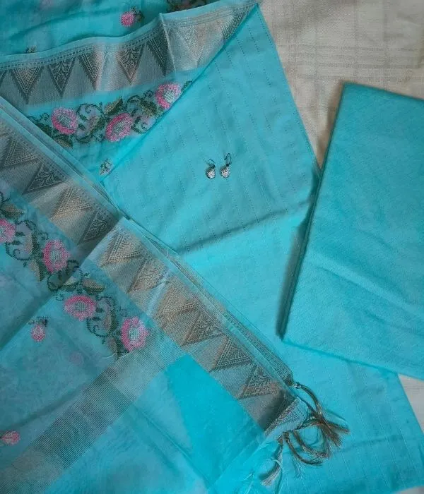 Dupatta: Lightweight cotton dupatta adorned with intricate embroidery and zari border, offering a graceful drape.