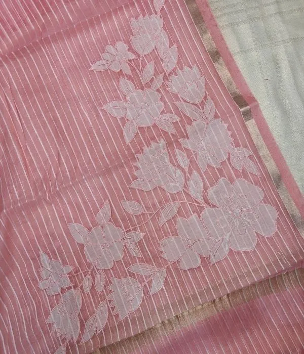 Dupatta: Highlighted with appliqué floral work on woven stripes, enhanced with fine zari detailing and tassels — giving it a refined, festive touch.