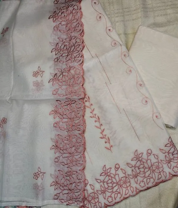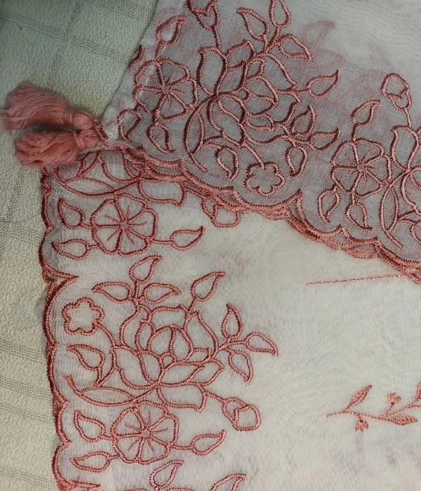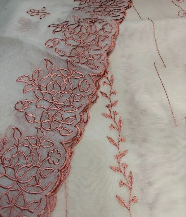 Dupatta Work: Intricate thread embroidery with scalloped floral edging