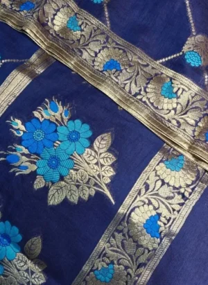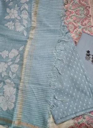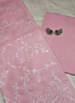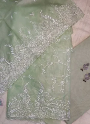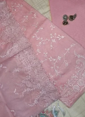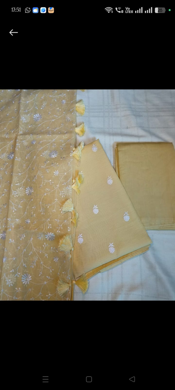Top: Soft cotton fabric adorned with delicate white chikankari-style floral embroidery, lending a subtle yet sophisticated charm.