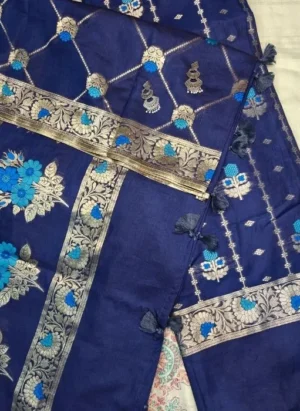 Dupatta: Complementing cotton dupatta featuring embroidered motifs, finished with a fine silver border and charming green tassel details on the edges.